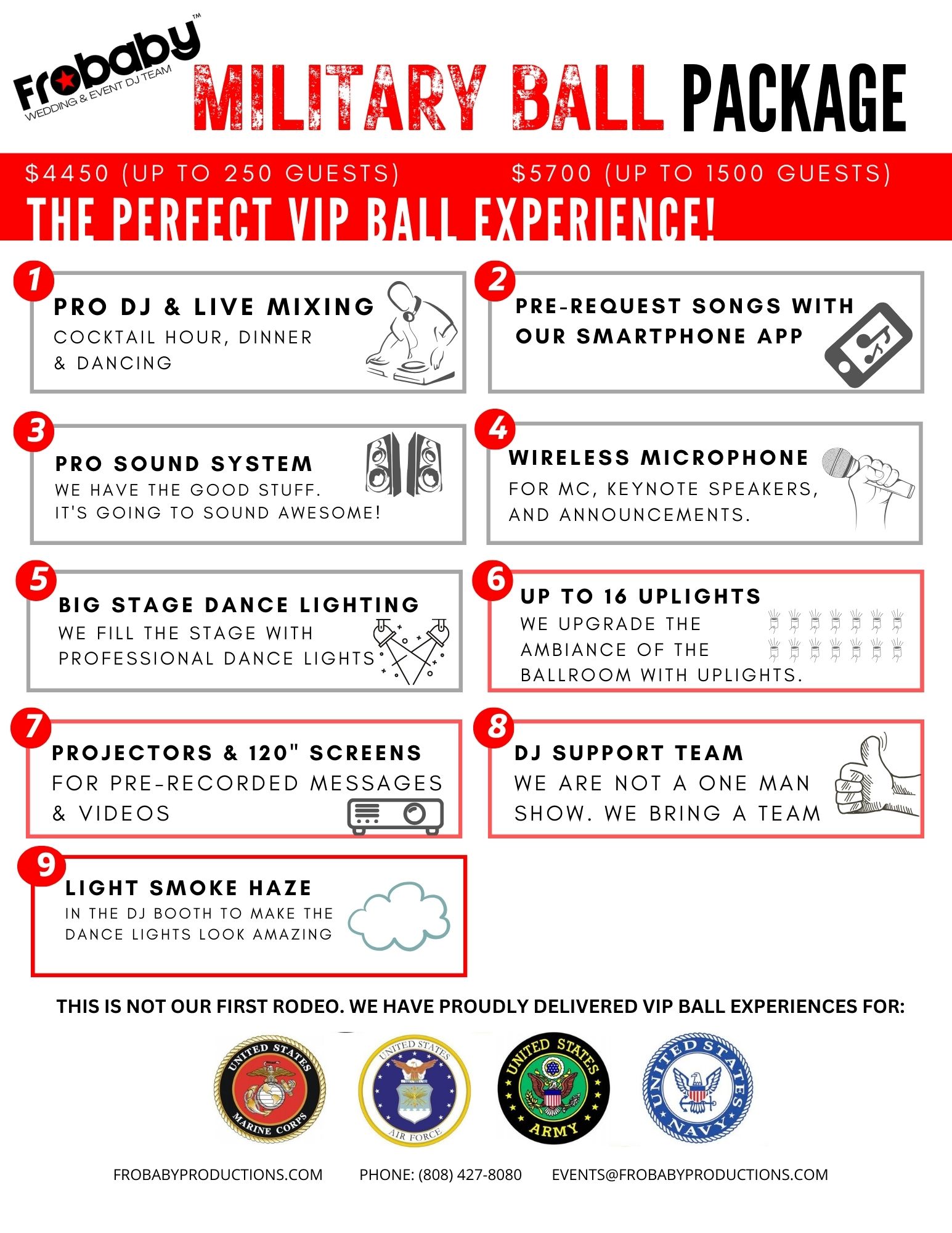 We know how to do military balls right, and we smash them! No more boring DJs. We play the right music. We have the right speakers and microphones. We have the projectors and screens. We have the passion and experience. We bring back up equipment. We have the team to make sure it goes smooth.
